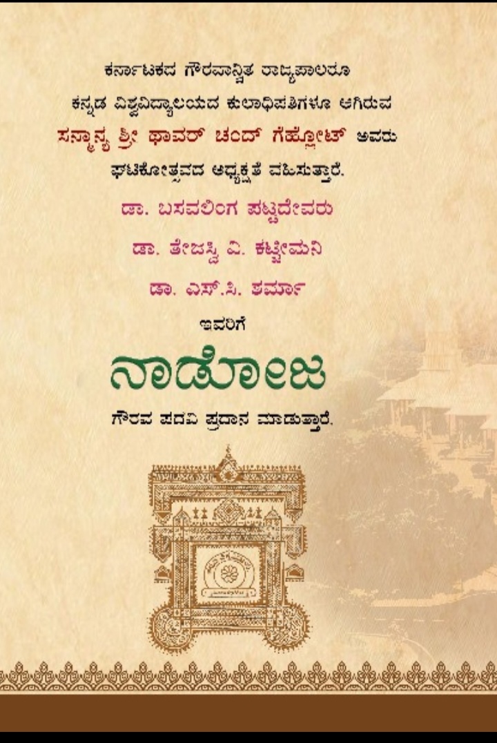 ಕನ್ನಡ ವಿಶ್ವವಿದ್ಯಾಲಯದ ಮಂಟಪ ಸಭಾಂಗಣದ ಸಿಂಡಿಕೇಟ್ ಹಾಲ್ನಲ್ಲಿ ದಿನಾಂಕ ೦೫.೦೧.೨೦೨೪ರಂದು ೩೨ನೇ ನುಡಿಹಬ್ಬದ ಪ್ರಯುಕ್ತ ಹಮ್ಮಿಕೊಂಡಿದ್ದ ಪತ್ರಿಕಾಗೋಷ್ಠಿಯನ್ನು ಉದ್ದೇಶಿಸಿ ಮಾತನಾಡಿದ ಅವರು ಸಮಾಜ ಸೇವೆಯಲ್ಲಿನ ಸಾಧನೆಗಾಗಿ ಬೀದರ್ ಜಿಲ್ಲೆಯ ಭಾಲ್ಕಿ ಹಿರೇಮಠದ ಡಾ. ಬಸವಲಿಂಗ ಪಟ್ಟದೇವರು, ಶಿಕ್ಷಣ ಕ್ಷೇತ್ರದಲ್ಲಿನ ಸಾಧನೆಗಾಗಿ ಆಂಧ್ರಪ್ರದೇಶದ ಬುಡಕಟ್ಟು ವಿಶ್ವವಿದ್ಯಾಲಯದ ಕುಲಪತಿ ಡಾ. ತೇಜಸ್ವಿ ವಿ. ಕಟ್ಟಿಮನಿ ಮತ್ತು ವಿಜ್ಞಾನ ಕ್ಷೇತ್ರದಲ್ಲಿನ ನ್ಯಾನೋ ಟೆಕ್ನಾಲಜಿ ವಿದ್ವಾಂಸರು ಹಾಗೂ ನ್ಯಾಕ್ ಸಂಸ್ಥೆಯ ಮಾಜಿ ನಿರ್ದೇಶಕರಾದ ಡಾ.ಎಸ್.ಸಿ. ಶರ್ಮಾ ಅವರನ್ನು ಕನ್ನಡ ವಿಶ್ವವಿದ್ಯಾಲಯದ ಪ್ರತಿಷ್ಠಿತನಾಡೋಜ ಪದವಿಗೆ ಆಯ್ಕೆ ಮಾಡಲಾಗಿದೆ ಎಂದು ಹೇಳಿದರು.