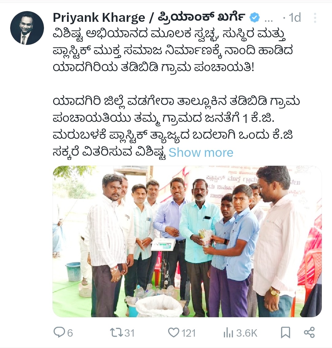 ಈ ವಿನೂತನ ಕಾರ್ಯಕ್ರಮವನ್ನು ಗ್ರಾಮೀಣಾಭಿವೃದ್ಧಿ ಮತ್ತು ಪಂಚಾಯತ್ ರಾಜ್ ಸಚಿವರಾದ ಪ್ರಿಯಾಂಕ ಖರ್ಗೆಯವರು ಮೆಚ್ಚುಗೆ ವ್ಯಕ್ತಪಡಿಸಿದ್ದಾರೆ. ತಮ್ಮ ಫೇಸ್ ಬುಕ್ ಮತ್ತು ಎಕ್ಸ್ ಖಾತೆಯಲ್ಲಿ ಮೆಚ್ಚುಗೆ ವ್ಯಕ್ತಪಡಿಸಿದ ಅವರು, ಇದು ರಾಜ್ಯದಲ್ಲಿಯೇ ಒಂದು ವಿಶಿಷ್ಟ ಅಭಿಯಾನವಾಗಿದ್ದು ಸ್ವಚ್ಛ ,ಸುಸ್ಥಿರ ಮತ್ತು ಪ್ಲಾಸ್ಟಿಕ್ ಮುಕ್ತ ಸಮಾಜ ನಿರ್ಮಾಣಕ್ಕೆ ನಾಂದಿ ಹಾಡಿದ ತಡಿಬಿಡಿ ಗ್ರಾಮ ಪಂಚಾಯಿತಿ.ಈ ಪಂಚಾಯಿತಿಯು ತಮ್ಮ ಗ್ರಾಮದ ಜನತೆಗೆ ಒಂದು ಕೆಜಿ ಪ್ಲಾಸ್ಟಿಕ್ ತ್ಯಾಜ್ಯದ ಬದಲಿಗೆ ಒಂದು ಕೆಜಿ ಸಕ್ಕರೆ ವಿತರಿಸುವ ಕಾರ್ಯಕ್ರಮ ಹಮ್ಮಿಕೊಂಡಿದ್ದು ಇದೊಂದು ವಿಶಿಷ್ಟ ಅಭಿಯಾನವಾಗಿದೆ. ಇದು ರಾಜ್ಯಾದ್ಯಂತ ಮೆಚ್ಚುಗೆಗೆ ಪಾತ್ರವಾಗಿದೆ.ಇದು ಸಾರ್ವಜನಿಕರಲ್ಲಿ ಲಾಭ ತಂದು ಕೊಡುತ್ತದೆ. ಪ್ಲಾಸ್ಟಿಕ್ ತ್ಯಜಿಸಿ ಸುಸ್ಥಿರ ಅಭಿವೃದ್ಧಿಗೆ ಸಾಧ್ಯವಾಗಿದೆ ಎಂದು ಶ್ಲಾಘಿಸಿದ್ದಾರೆ.