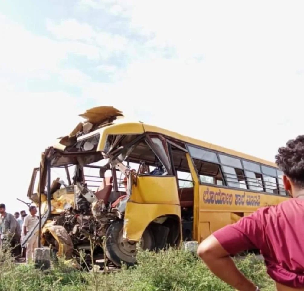 K. S. R. T. C ಬಸ್ ಮತ್ತು ಲೋಯಲ್ ಶಾಲೆಯ ವಾಹನ ಮುಖಮುಖಿ ಡಿಕ್ಕಿ ಸ್ಥಳದಲ್ಲಿ ಎರಡು ವಿದ್ಯಾರ್ಥಿಗಳ ಸಾವು ಚಾಲಕರ ನಿರ್ಲಕ್ಷ್ಯ.