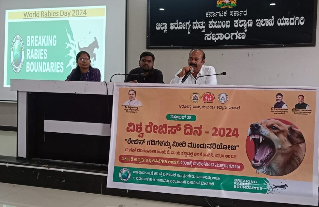 2024 ಘೋಷವಾಕ್ಯಾ “ರೇಬಿಸ್ ಗಡಿಗಳನ್ನು ಮೀರಿ ಮುಂದುವರಿಯೋಣ” ಎಂದು ಇರುತ್ತದೆ, ಯಾವುದೆ ಪ್ರಾಣಿ ಕಡಿತಕ್ಕೆ ಒಳಗಾದರೆ ನಿರ್ಲಕ್ಷಿಸಬೇಡಿ. ಸಾಬೂನನ್ನು ಬಳಸಿ 15 ನಿಮಿಷಗಳ ಕಾಲ ಗಾಯವನ್ನು ನಿರಂತರವಾಗಿ ನೀರಿನಿಂದ ತೊಳೆಯಿರಿ. ರೇಬಿಸ್ ನಿರೋಧಕ ಚುಚ್ಚುಮದ್ದು ಮತ್ತು ಇಮ್ಯೂನೋಗ್ಲೋಬಲಿನ್ ವೈದ್ಯರ ಸಲಹೆಯಂತೆ ಪೂರ್ಣಗೊಳಸಬೇಕು ಎಂದು ಯಾದಗಿರಿ ಜಿಲ್ಲಾ ಆರೋಗ್ಯ ಮತ್ತು ಕುಟುಂಬ ಕಲ್ಯಾಣ ಅಧಿಕಾರಿಗಳಾದ ಡಾ.ಎಮ್.ಎಸ್ ಪಾಟೀಲ್ ಅವರು ಸಲಹೆ ನೀಡಿದರು.