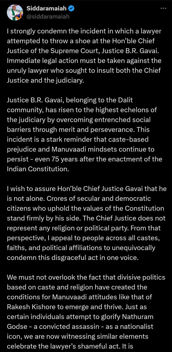 ದಲಿತ ಸಮುದಾಯಕ್ಕೆ ಸೇರಿರುವ ನ್ಯಾಯಮೂರ್ತಿ ಬಿ.ಆರ್.ಗವಾಯಿ ಅವರು ಸಾಮಾಜಿಕ ಪ್ರತಿರೋಧಗಳನ್ನು ಎದುರಿಸಿ ಅರ್ಹತೆ ಮತ್ತು ಸಾಧನೆ ಮೂಲಕ ಉನ್ನತ ಸ್ಥಾನಕ್ಕೇರಿದವರು. ಜಾತಿ ಮೂಲದ ಅಸಮಾನತೆ ಮತ್ತು ಅಸಹನೆ ಸಂವಿಧಾನ ಜಾರಿಗೆ ಬಂದ 75 ವರ್ಷಗಳ ನಂತರವೂ ಮನುವಾದಿಗಳ ಮನಸ್ಸಲ್ಲಿ ಭಧ್ರವಾಗಿ ಉಳಿದುಕೊಂಡಿದೆ ಎನ್ನುವುದಕ್ಕೆ ಇಂದಿನ ಘಟನೆ ಸಾಕ್ಷಿಯಾಗಿದೆ ಎಂದು ಸಿಎಂ ಹೇಳಿದ್ದಾರೆ.