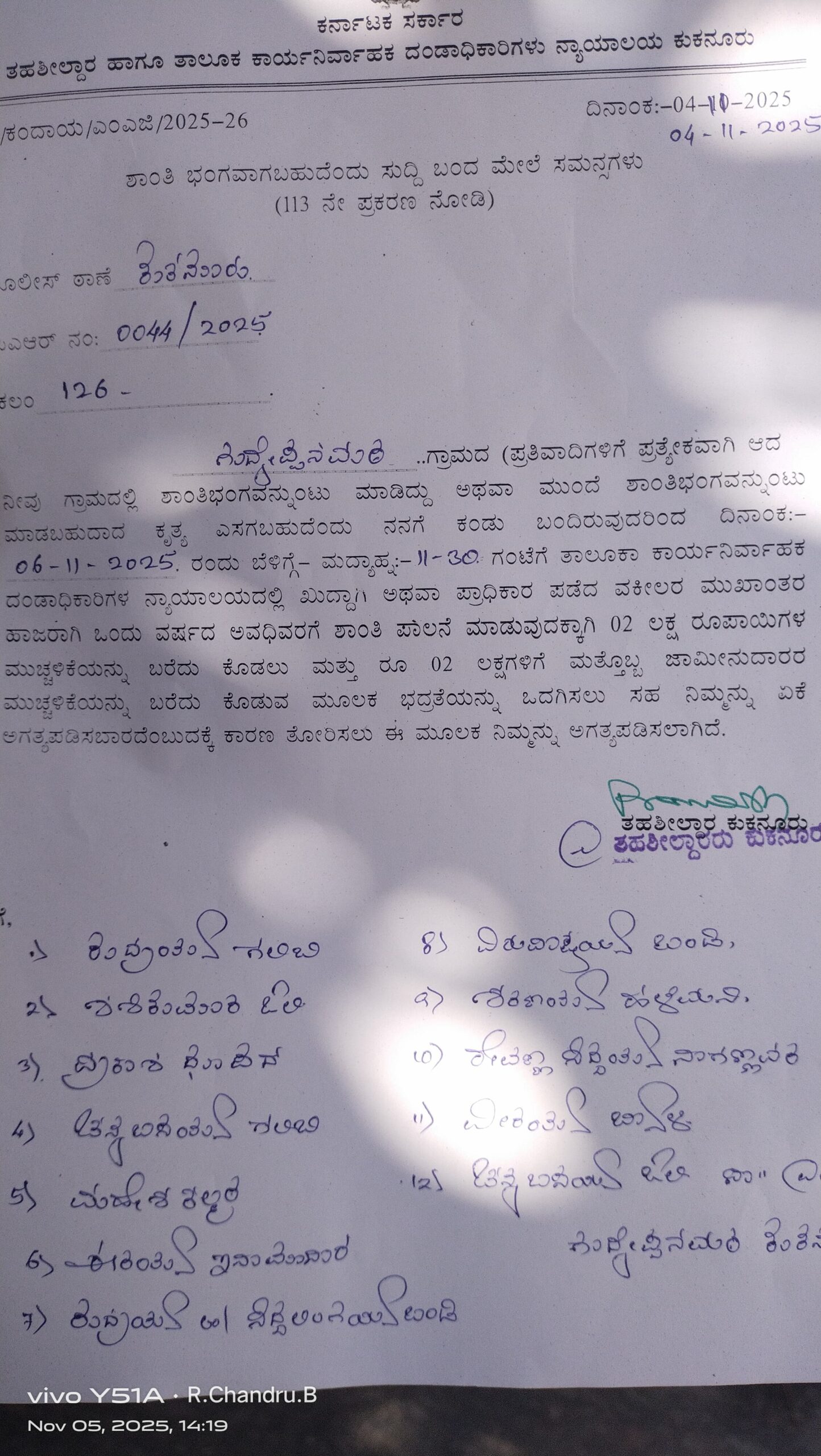ಗುದ್ದೆಪ್ಪನಮಠ ಗ್ರಾಮದ ಪ್ರತಿವಾದಿಗಳಿಗೆ ಪ್ರತ್ಯೇಕವಾಗಿ ಆದ ನೀವು ಗ್ರಾಮದಲ್ಲಿ ಶಾಂತಿಭಂಗವನ್ನುಂಟು ಮಾಡಿದ್ದು ಅಥವಾ ಮುಂದೆ ಶಾಂತಿಭಂಗವನ್ನುಂಟು ಮಾಡಬಹುದಾದ ಸಾಧ್ಯತೆ ಇರುವುದರಿಂದ ಕೃತ್ಯ ಎಸಗಬಹುದೆಂದು ನನಗೆ ಕಂಡು ಬಂದಿರುವುದರಿಂದ ನ. 6 ರಂದು ಬೆಳಿಗ್ಗೆ 11 – 30 ಗಂಟೆಗೆ ತಾಲೂಕಾ ಕಾರ್ಯನಿರ್ವಾಹಕ ದಂಡಾಧಿಕಾರಿಗಳ ನ್ಯಾಯಾಲಯದಲ್ಲಿ ಖುದ್ದಾಗಿ ಅಥವಾ ಪ್ರಾಧಿಕಾರ ಪಡೆದ ವಕೀಲರ ಮುಖಾಂತರ ಹಾಜರಾಗಿ ಒಂದು ವರ್ಷದ ಅವಧಿವರೆಗೆ ಶಾಂತಿ ಪಾಲನೆ ಮಾಡಬೇಕು. ಜೊತೆಗೆ 02 ಲಕ್ಷ ರೂಪಾಯಿಗಳ ಮುಚ್ಚಳಿಕೆಯನ್ನು ಬರೆದು ಕೊಡಲು ಮತ್ತು ರೂ 02 ಲಕ್ಷಗಳಿಗೆ ಮತ್ತೊಬ್ಬ ಜಾಮೀನುದಾರರ ಮುಚ್ಚಳಿಕೆಯನ್ನು ಬರೆದು ಕೊಡುವ ಮೂಲಕ ಭದ್ರತೆಯನ್ನು ಒದಗಿಸಲು ಸಹ ನಿಮ್ಮನ್ನು ಏಕೆ ಆಗತ್ಯಪಡಿಸಬಾರದೆಂಬುದಕ್ಕೆ ಕಾರಣ ತೋರಿಸಲು ಈ ಮೂಲಕ ನಿಮ್ಮನ್ನು ಅಗತ್ಯಪಡಿಸಲಾಗಿದೆ ಎಂದು ತಹಶೀಲ್ದಾರ್ ಹೆಚ್ ಪ್ರಾಣೇಶ್ ಸಮನ್ಸ್ ಜಾರಿ ಮಾಡಿರುವ ಪತ್ರದಲ್ಲಿದೆ ಎನ್ನಲಾಗಿದೆ.