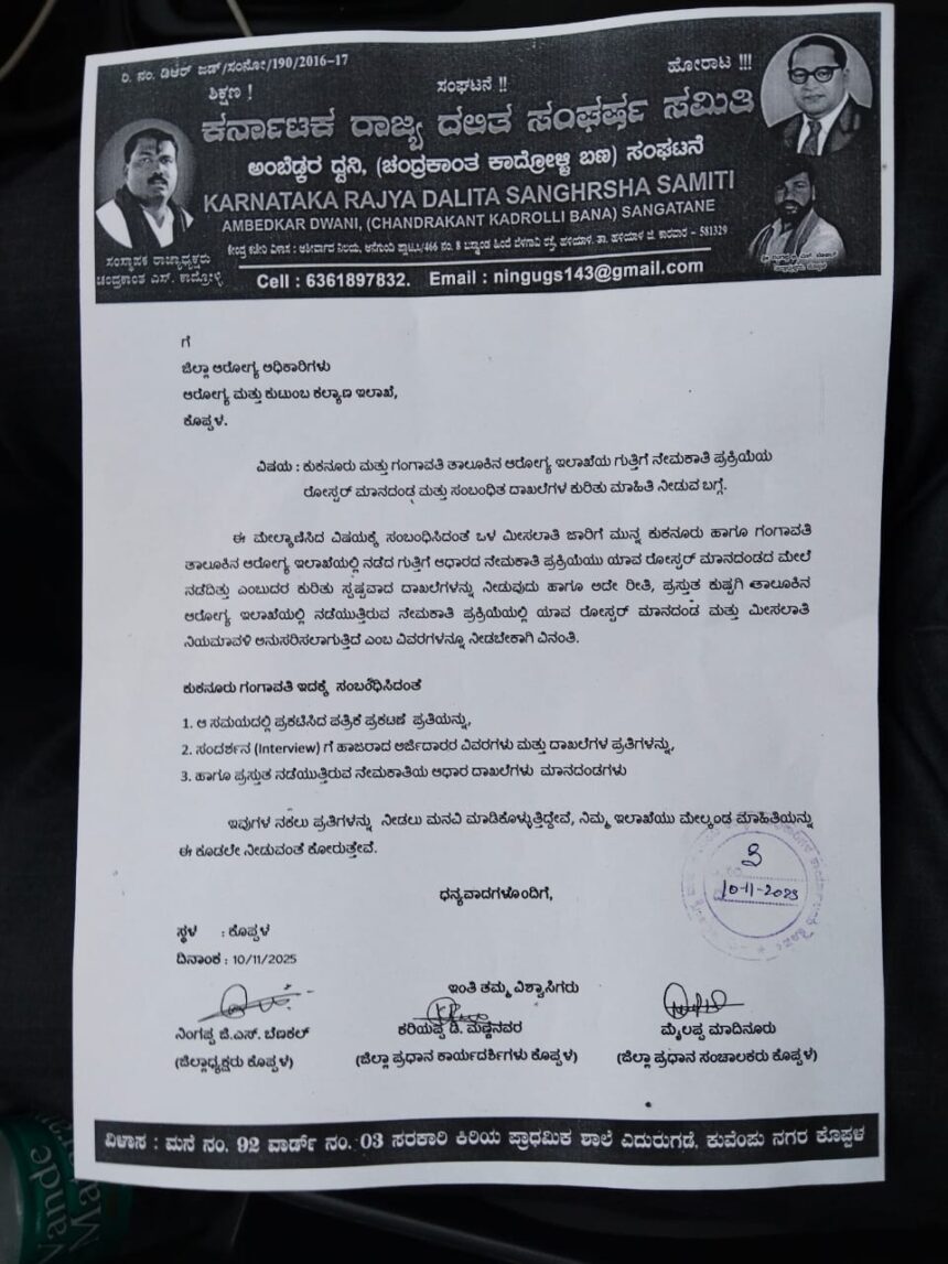 ಕುಷ್ಟಗಿಯ ಆರೋಗ್ಯ ಮತ್ತು ಕುಟುಂಬ ಕಲ್ಯಾಣ ಇಲಾಖೆಯಲ್ಲಿ ಒಳಮೀಸಲಾತಿ ಜಾರಿ ಬಳಿಕ ಉದ್ಯೋಗ ನೇಮಕಾತಿ ಹಂಚಿಕೆಯಲ್ಲಿ ರೋಸ್ಟರ್ ನಿಯಮ ಪಾಲಿಸುತ್ತಿಲ್ಲ ಎಂದು ಆರೋಪಿಸಿ ಕರ್ನಾಟಕ ರಾಜ್ಯ ದಲಿತ ಸಂಘರ್ಷ ಸಮಿತಿ (ಅಂಬೇಡ್ಕ್ ರ್ ಧ್ವನಿ) ಚಂದ್ರಕಾಂತ ಕಾದ್ರೋಳ್ಳಿ ಬಣ) ಕಾರ್ಯಕರ್ತರು ಜಿಲ್ಲಾ ಆರೋಗ್ಯ ಮತ್ತು ಕುಟುಂಬ ಕಲ್ಯಾಣಾಧಿಕಾರಿ ಅವರಿಗೆ ಸೋಮವಾರ ಮನವಿ ಪತ್ರ ಸಲ್ಲಿಸಿದರು.