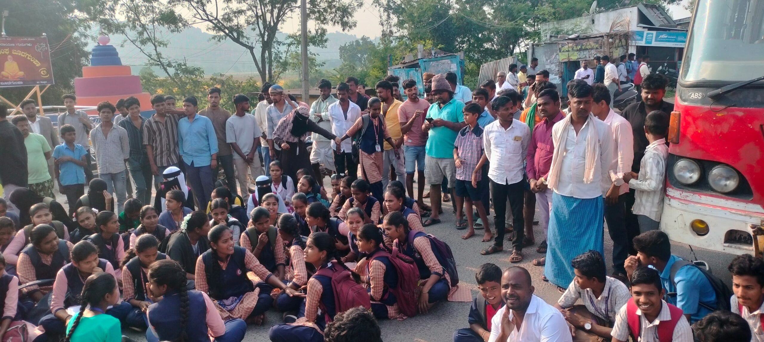 ಬಸ್ ನಿಲುಗಡೆ, ತಂಗುದಾಣ ನಿರ್ಮಾಣಕ್ಕೆ ಆಗ್ರಹ”