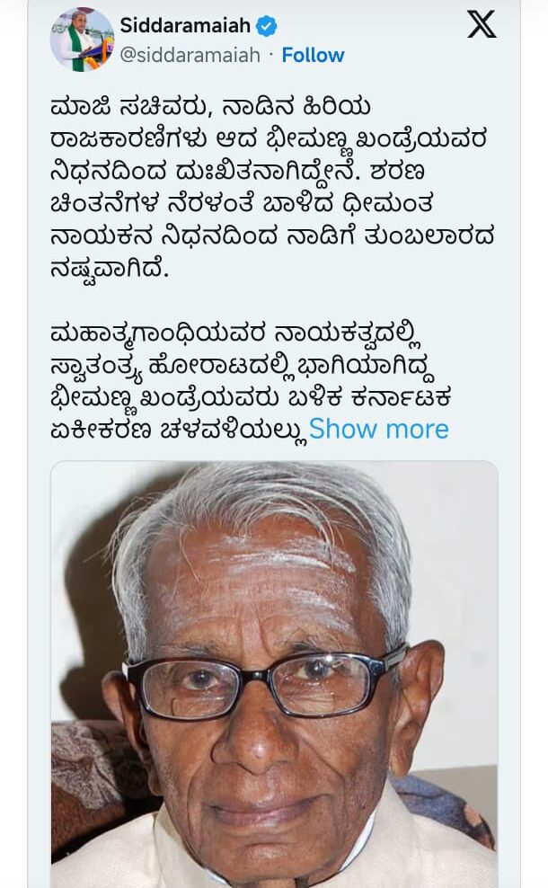 🚨 BREAKING NEWS : “ಬೀದರ|ಶತಾಯುಷಿ, ಮಾಜಿ ಸಚಿವ ಭೀಮಣ್ಣ ಖಂಡ್ರೆ ಇನ್ನಿಲ್ಲ! ಸಿ.ಎಂ.ಸಿದ್ದರಾಮಯ್ಯ ಸೇರಿ ಹಲವು ಗಣ್ಯರ ಸಂತಾಪ”