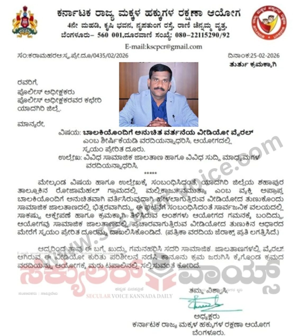 CRIME NEWS : “ಶಹಾಪುರ| ಅಪ್ರಾಪ್ತೆ ಬಾಲಕಿಯೊಂದಿಗೆ ಮಹಲ್ ರೋಜಾ ಮುತ್ಯಾನ ಅನುಚಿತ ವರ್ತನೆ ಆರೋಪದ ವೀಡಿಯೋ ವೈರಲ್ : ಸ್ವಯಂ ಪ್ರೇರಿತ ದೂರು ದಾಖಲು “