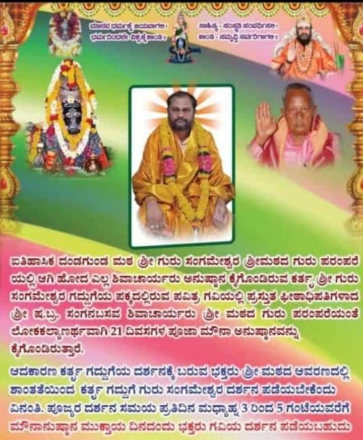ಕಲಬುರಗಿ: ಅಪಾರ ಭಕ್ತರ ಆರಾಧ್ಯ ದೇವರು, ಬೇಡಿದ ಭಕ್ತರ ಕಾಮದೇನು ಆಗಿರುವ ಚಿತ್ತಾಪುರ ತಾಲೂಕಿನ ಸುಕ್ಷೇತ್ರ ದಂಡಗುಂಡ ಮಠದ ಶ್ರೀಗುರುಸಂಗಮೇಶ್ವರ ಗದ್ದುಗೆ ಪಕ್ಕದಲ್ಲಿರುವ ಪವಿತ್ರ ಗವಿಯಲ್ಲಿ ಹಾಲಿ ಪೀಠಾಧಿಪತಿ ಸಂಗನಬಸವ ಶಿವಾಚಾರ್ಯರು ಲೋಕಕಲ್ಯಾಣಕ್ಕಾಗಿ ೨೧ ದಿನಗಳ ಪೂಜಾ ಮೌನಾನುಷ್ಠಾನವನ್ನು ಕೈಗೊಂಡಿದ್ದಾರೆ.